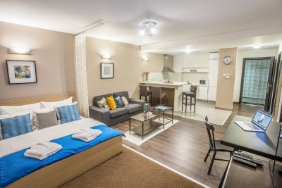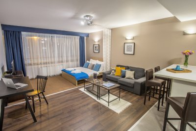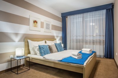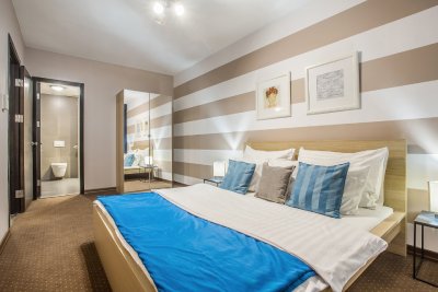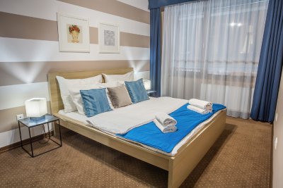 These modern design Superior One-Bedroom Apartments offers a comfortable stay for guests who enjoying a shorter or longer stay in the Hungarian capital. Each apartments have a unique and elegant design, which is a perfect choice for couples, families and business travelers alike. The 55-60 m2 apartments feature a bedroom with a luxurious double bed, a spacious air-conditioned living room, a well-equipped American style kitchen with a dining area and every comfort you need after a long day in Budapest. The living room includes a comfortable sofa, an LCD TV with a collection of local and international channels, a DVD player and complimentary Wifi Internet access. All of our guests are given free access to the Wellness & Fitness area. In addition, each apartment can be equipped with a washing machine to be used at the guests’ convenience.